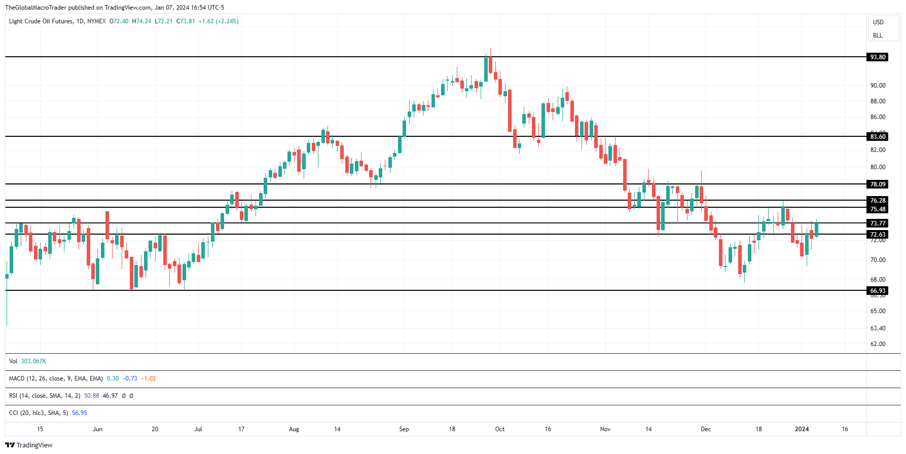 After I closed out my short, I am inclined to go long. The price action is very interesting, but geopolitics and war are very tough to get correct. I would like to see a few more days of consolidation, then strength to the upside. The $75.50-$76 area is very interesting, I would want to see how the market reacts in this region. It may very well enter into a lot of selling/resistance, or conversely sellers may be overwhelmed by buyers. Patience and the sidelines for now.